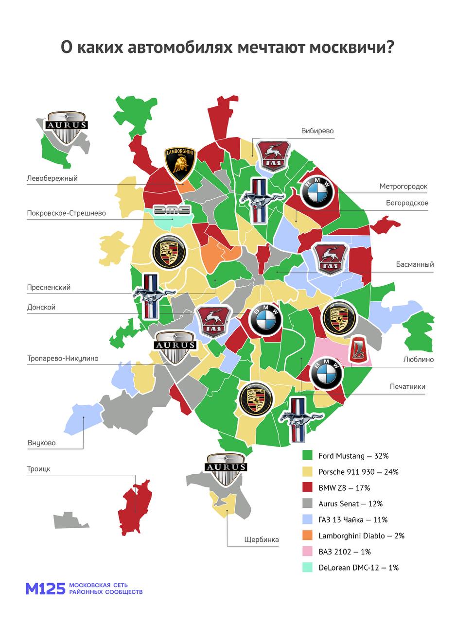 Лидером стал Ford Mustang — его выбрали в 32% районах, например, в Печатниках и Басманном